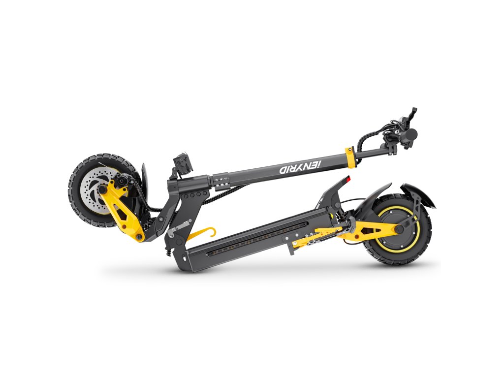 iENYRID ES1 je navrhnutá tak, aby spájala výkon s praktickosťou. Vďaka sklápateľným riadidlám ju bez problémov uložíte do kufra auta alebo prinesiete do bytu. Silné odpruženie, terénne pneumatiky a stabilná konštrukcia robia z tejto kolobežky univerzálneho partnera – do práce, na nákup aj na víkendové dobrodružstvá mimo mesta.